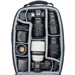 - Tripod yuvası ve yan tarafta su şişesi cebi. (Daha büyük tripodlar için ek kayışlar dahildir)